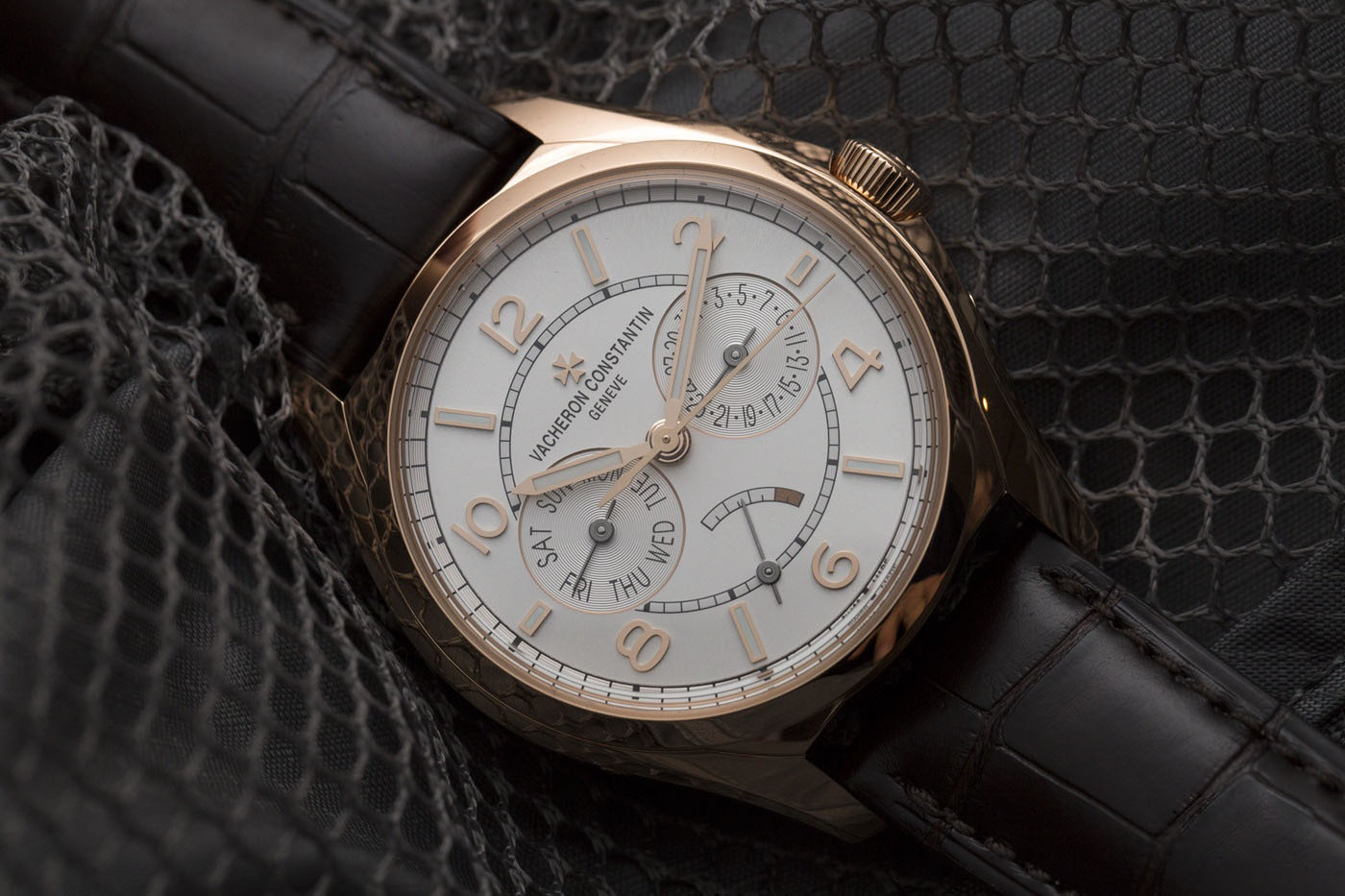 FiftySix Day-Date的设计没有采用全历款的视窗型,而是采用左右对称布局的副表盘分别显示星期和日期,使表盘更加丰满,也恒久清晰易读,6点位置的扇形与指针动力储存稍许打破了表盘的平衡,考虑到所搭载的是自动机芯,也许取消动力储存或者移到表背显示会更好?——做一只纯粹的Day-Date?Cal. 2475 SC/2机芯是一枚不折不扣的由江诗丹顿自主设计制作的机芯,经过日内瓦印记认证。