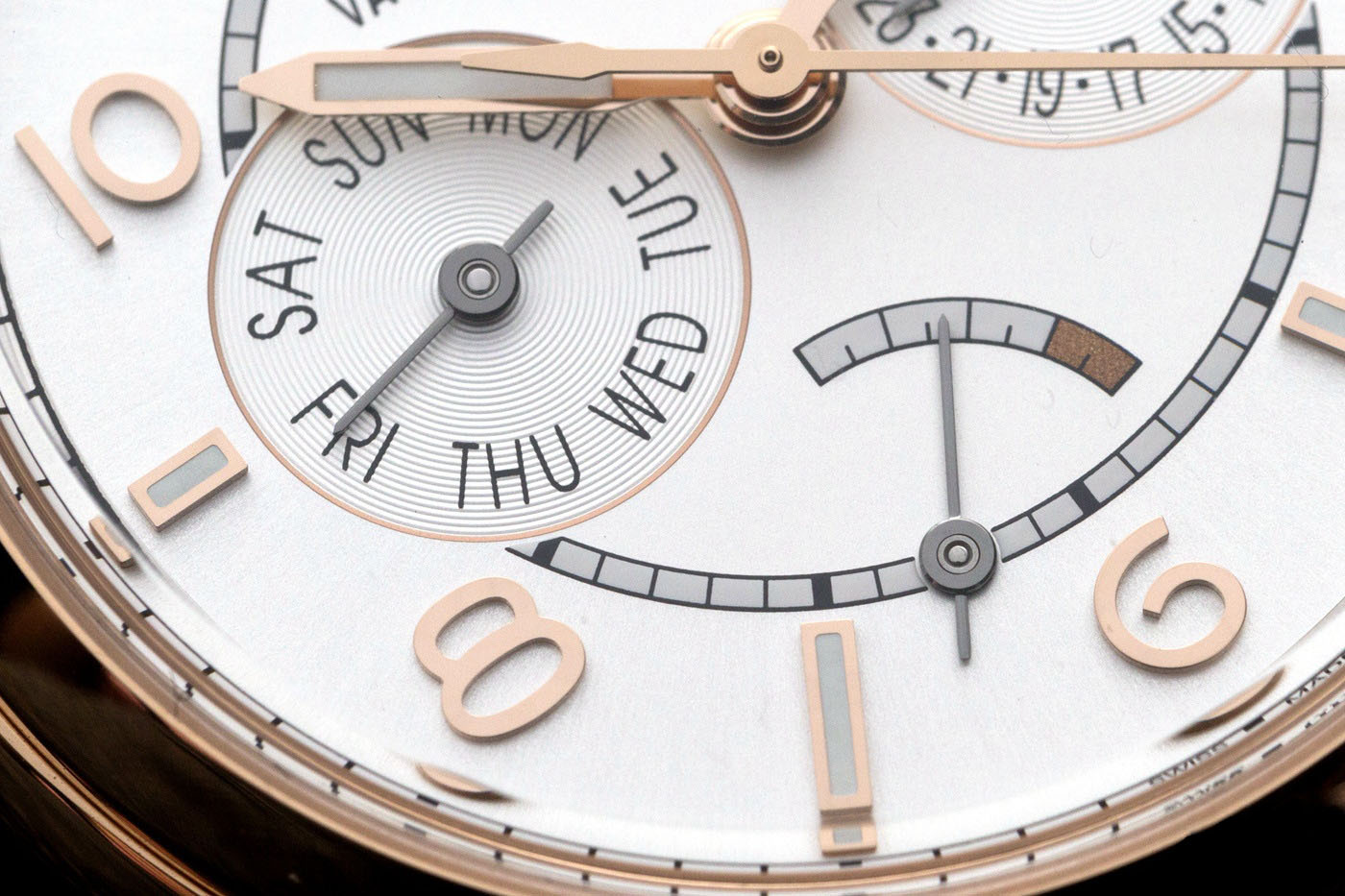 功能区域划分明显:最外圈日历,环形纹装饰,棒形时标和阿拉伯数字结合,轨道式分钟刻度,内部为星期和月份视窗,主表盘采用了哑光放射纹处理