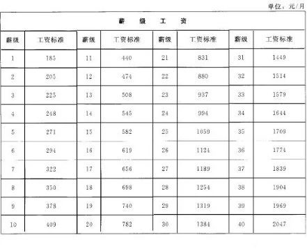 二、薪级工资薪级工资主要体现工作人员的工作表现和资历。对专业技术人员和管理人员设置65个薪级;对工人设置40个薪级,每个薪级对应一个工资标准。