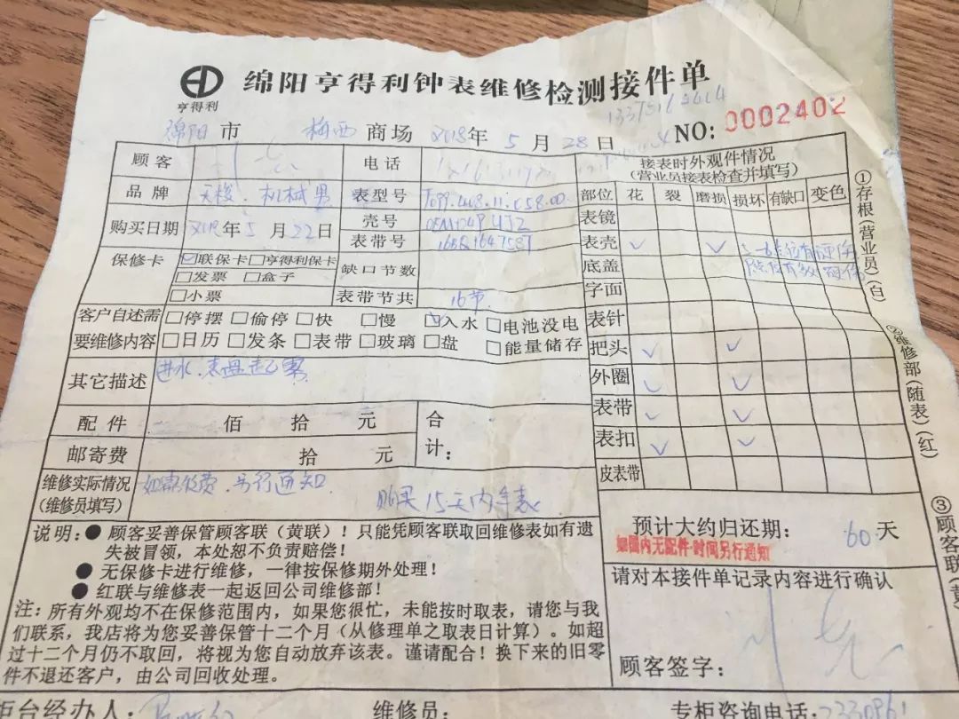 第二次因为超过了包换期,所以只为她修理好手表,但手表依然反复出现起雾进水的问题。