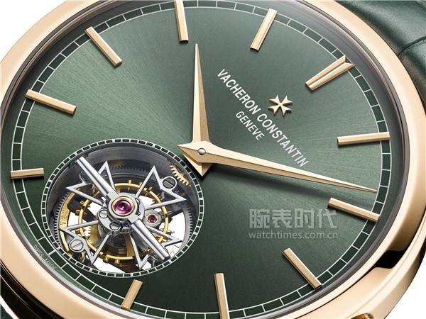 腕表采用41毫米18K 5N玫瑰金表壳,饰有旭日纹的帝王绿表盘搭配金质棒状时标和太妃指针。金玉相逢,便胜却人间无数。轨道式分钟刻度圈和陀飞轮外缘的轨道式刻度圈两两呼应,尽显君子仪表之美。
