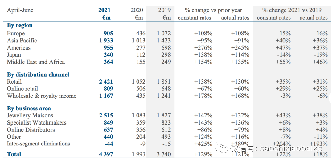 卡地亚(Cartier)和梵克雅宝(Van Cleef & Arpels)的珠宝和手表销售强劲,推动珠宝部门的销售额增长了 43%。在大多数地区的线上和线下零售销售增长的推动下, 专业制表商的销售额增长了 6%